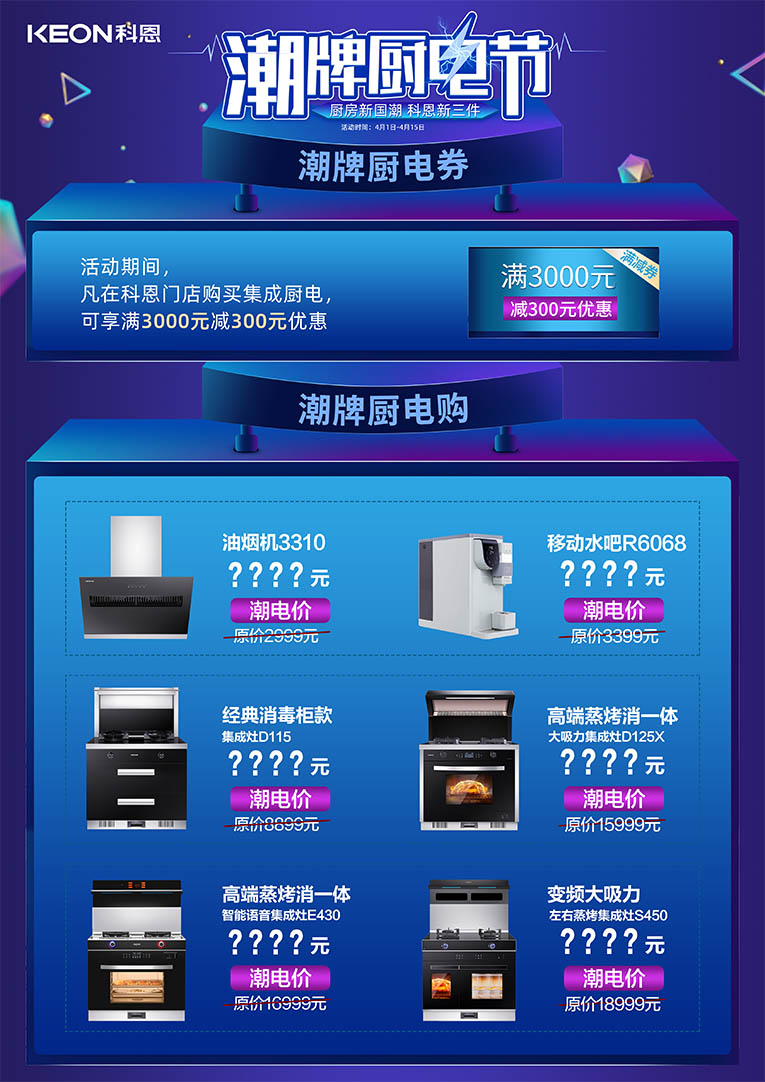 除此之外,更有科恩全國六大戰區同時發力,只為給全國用戶帶來瘋狂特惠?。?月1日——4月15日,進科恩門店,潮牌廚電節,更多驚喜等你揭秘~