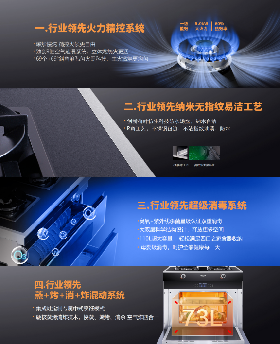 C系列集成灶配備的四項行業(yè)領(lǐng)先創(chuàng)新技術(shù):火力精控系統(tǒng)、納米無指紋易潔工藝、超級消毒系統(tǒng)、蒸烤消炸混動系統(tǒng)——直擊當下消費痛點,徹底解決用戶使用需求,從大火力大吸力、易清潔易打理、廣收納懂消殺、多功能全集成四個維度力破當下行業(yè)四大頑固堵點。