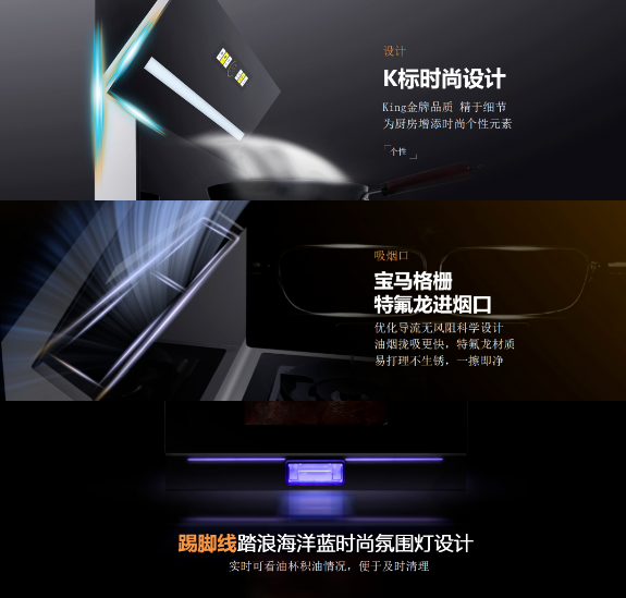 科恩C系列兩款王炸產(chǎn)品:C200消毒柜款集成灶、C260蒸烤消炸一體集成灶,在預熱期間就極具熱度,如今終于華麗登場,從外觀來看,此次的C系列完全顛覆了以往集成灶笨重且不夠美觀的形象,創(chuàng)造性的采用了企業(yè)標識“K”字型時尚機頭,寶馬經(jīng)典格柵設(shè)計進煙口,以及踏浪海洋藍時尚氛圍燈底座設(shè)計,盡覽奢美,構(gòu)筑視覺與觸覺的全新想象,一眼,鮮明,再睹,目不轉(zhuǎn)睛!