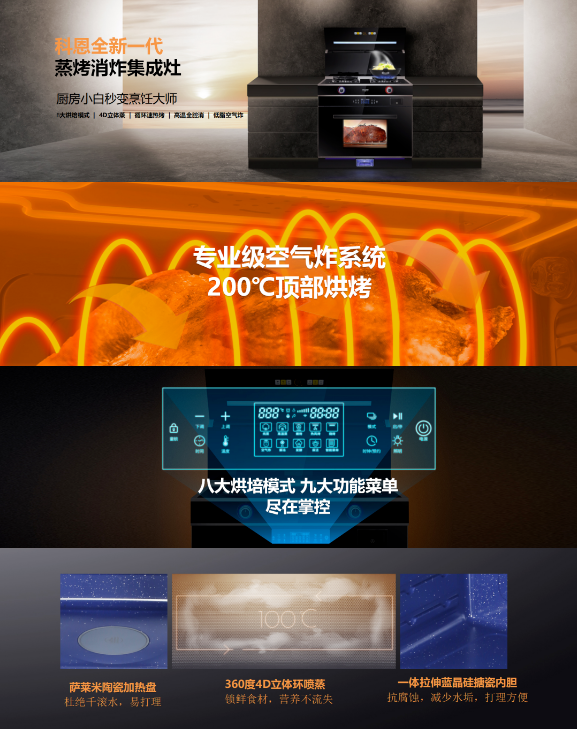 除了在外形上的顛覆常規(guī)、以型造境之外,C系列集成灶在功能實用上的優(yōu)勢也可圈可點,以C260蒸烤消炸集成灶為例,集鮮蒸、嫩烤、消殺、空氣炸于一體,美味健康四合一。八大烘焙模式、九大功能菜單、4D立體蒸、循環(huán)速熱烤、高溫全腔消、低脂空氣炸,自動烹飪,輕松上手,一臺科恩C260集成灶頂?shù)昧艘粋€專業(yè)級烹飪大師,實在令人心動!