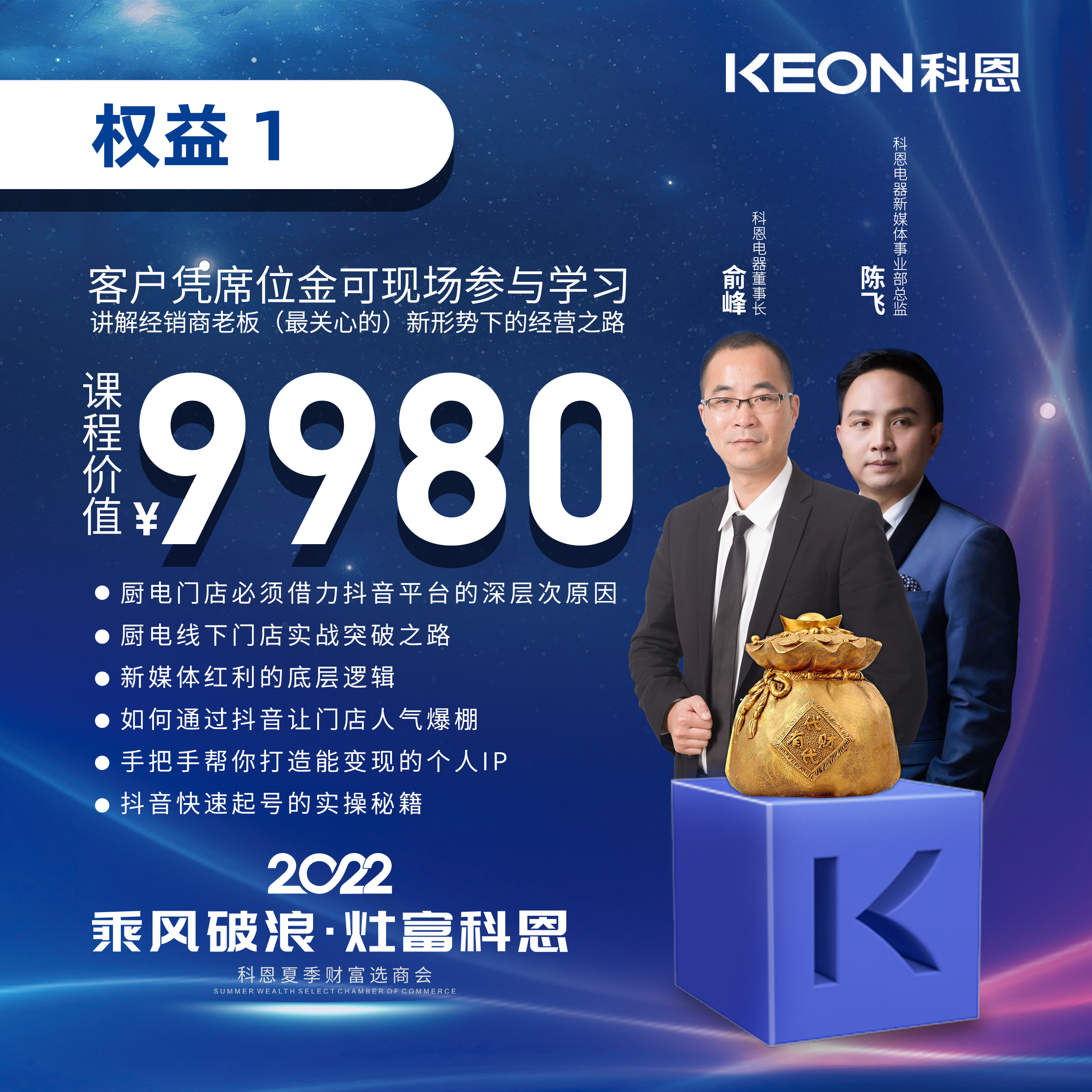 權(quán)益一、客戶憑席位金可現(xiàn)場參與學(xué)習(xí)時下經(jīng)銷商老板最為關(guān)心的新形勢下的經(jīng)營之路,科恩電器董事長攜新媒體事業(yè)中心團隊親身入局,創(chuàng)新立意開辟抖音引流變現(xiàn)的新賽道新玩法,手把手幫你打造能變現(xiàn)的個人IP,助力經(jīng)銷商在新零售市場前景下,輕松實現(xiàn)彎道超車。