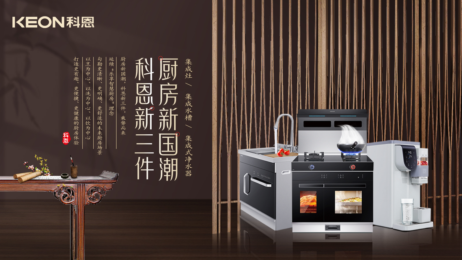 廚房新國潮,科恩新三件,樂享智慧廚房,科恩電器形成以“集成灶、集成水槽、多功能移動凈水器”的科恩新三件,打造廚房新國潮,于方寸間體會更多愜意,于細微處,感受更多用心!