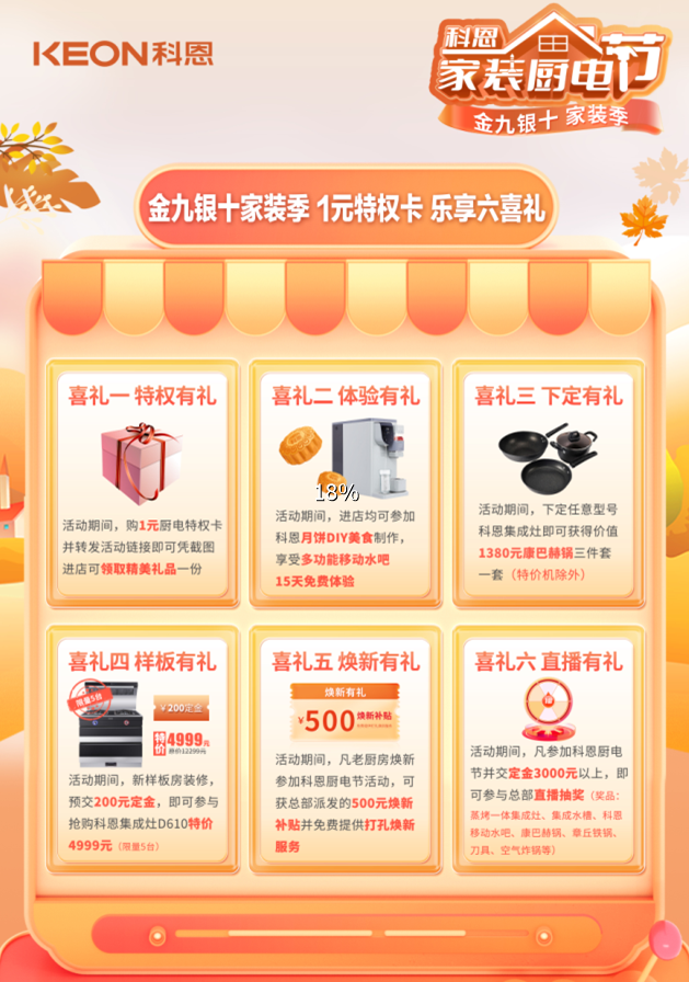 金九銀十家裝季,科恩集成灶推出科恩家裝廚電節(jié),不僅有1元家裝特權卡,0元搶廚電,提前鎖定直播抽大獎名額,還能樂享六大喜禮,特權有禮、下定有禮、樣板有禮、煥新有禮、直播有禮,進店即可參加科恩月餅DIY美食制作,還有15天移動水吧免費體驗,一塊錢就能買到的快樂,怎么算都劃算!