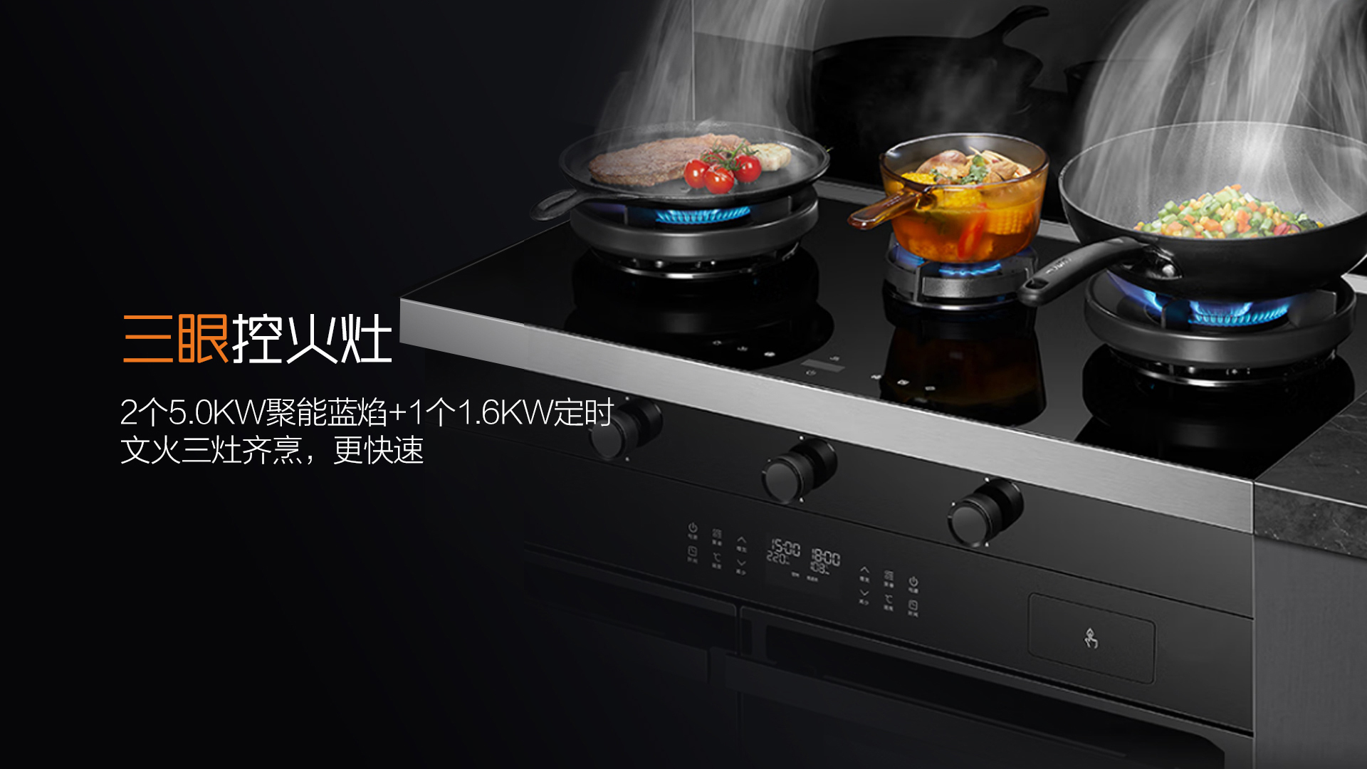 A3系列擁有2個5.0KW聚能藍焰+1個1.6KW定時文火,爆炒同時還能煲湯。一次可烹飪3道菜肴,兩菜一湯輕松搞定。且定時功能可以精確熄火時間,免去了看護煩惱!
