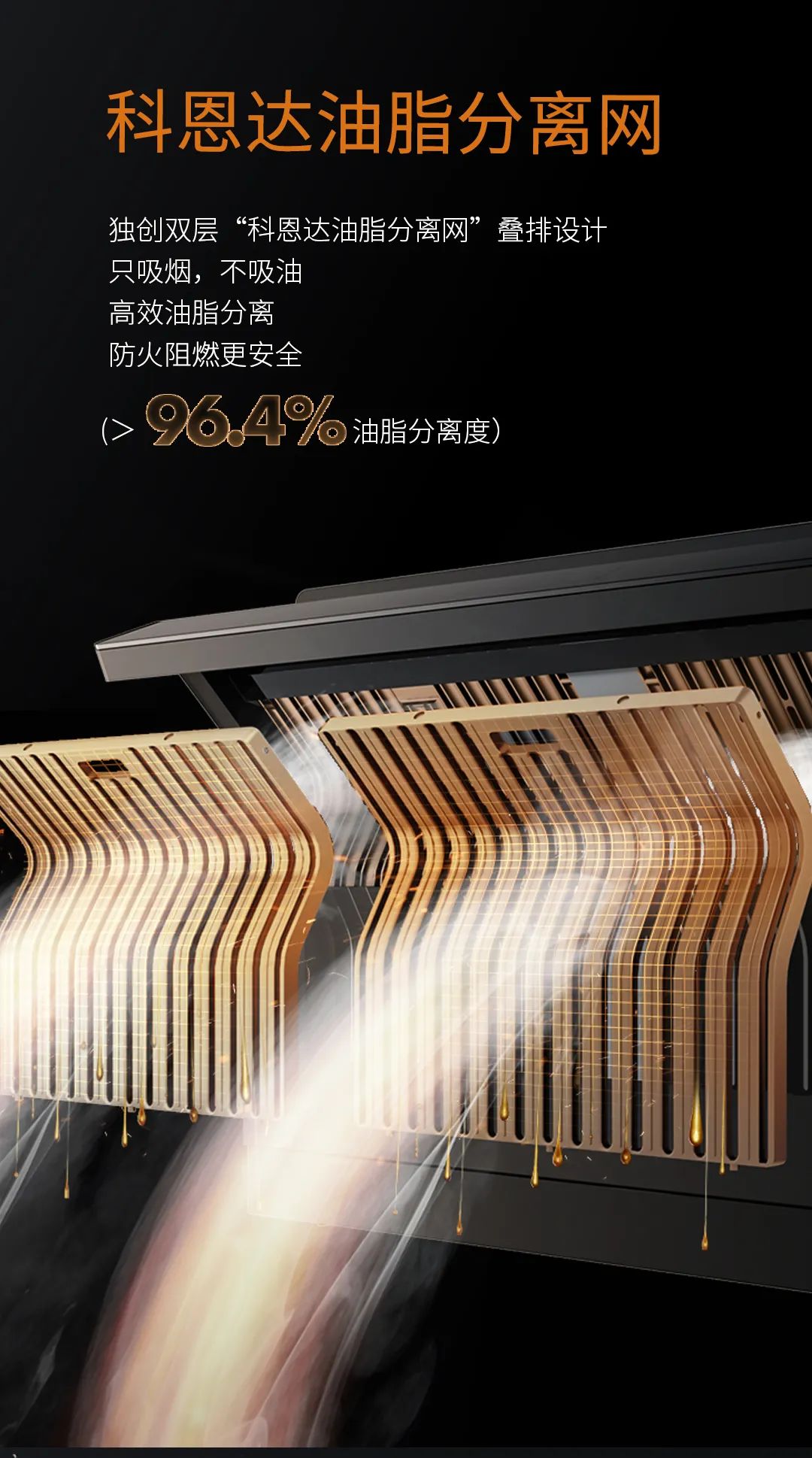 6K省心超體驗二:科學設計免清洗,耐用省心科恩達油脂分離網完美實現煙機免清洗。科恩達油脂分離網可實現高效油脂分離,油脂分離率>96%,實現油脂不進門,煙機免清洗的理想狀態。