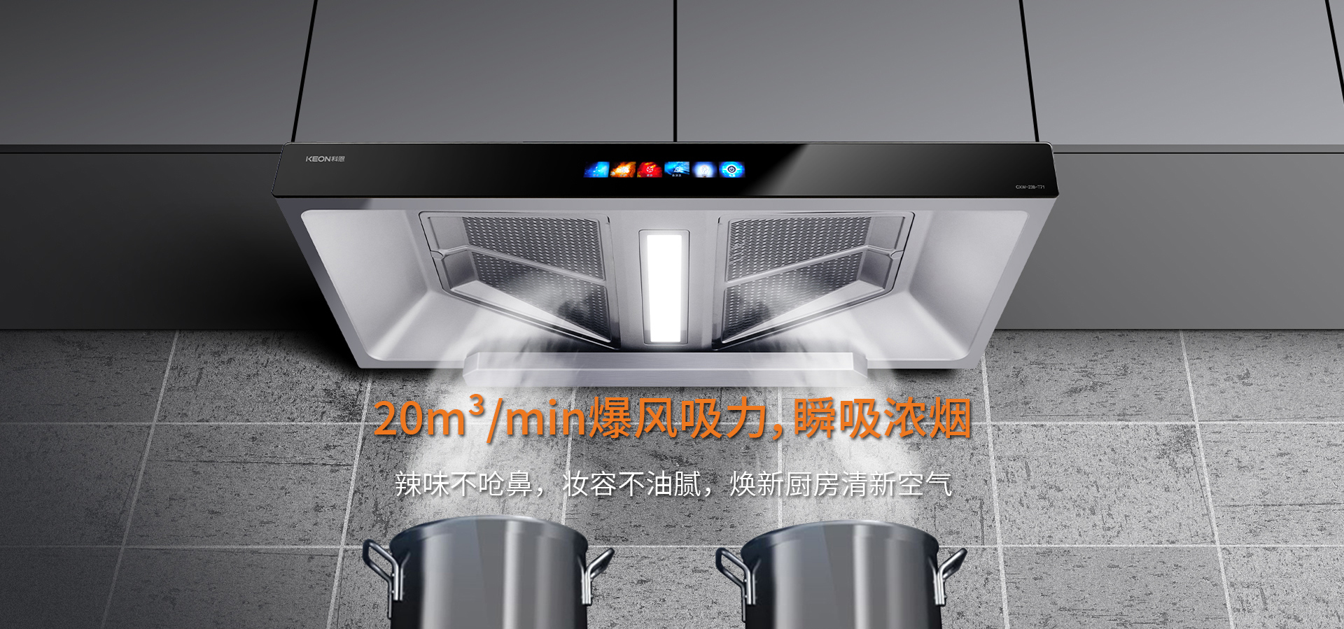 科恩T71油煙機采用超薄頂吸式,可輕松“隱身”,廚房更具美感。