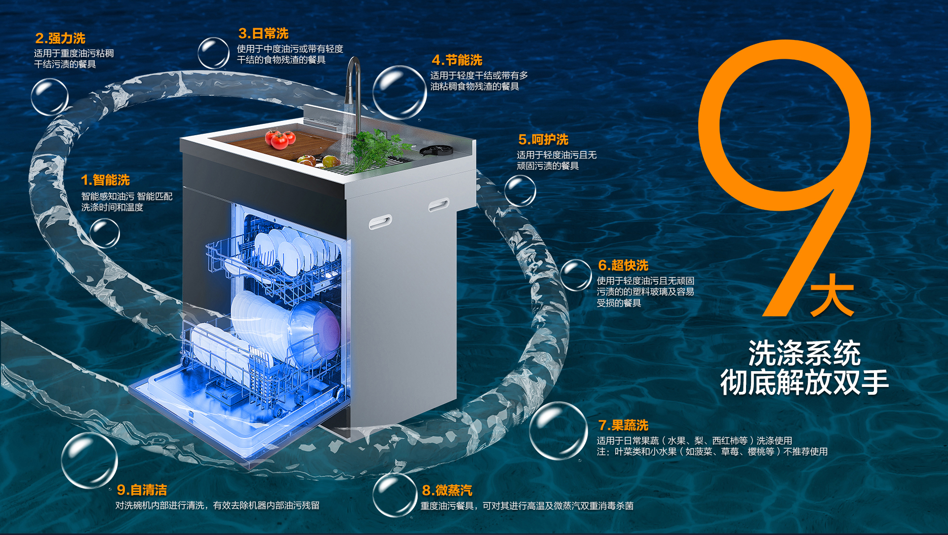 9大定制洗滌系統(tǒng),讓碗筷清洗更智慧。同時,還貼心設置清洗蔬果,告別蔬果農殘。