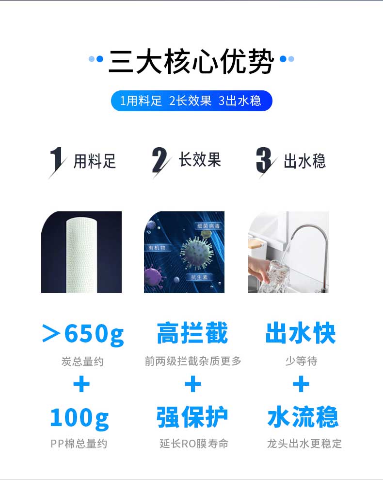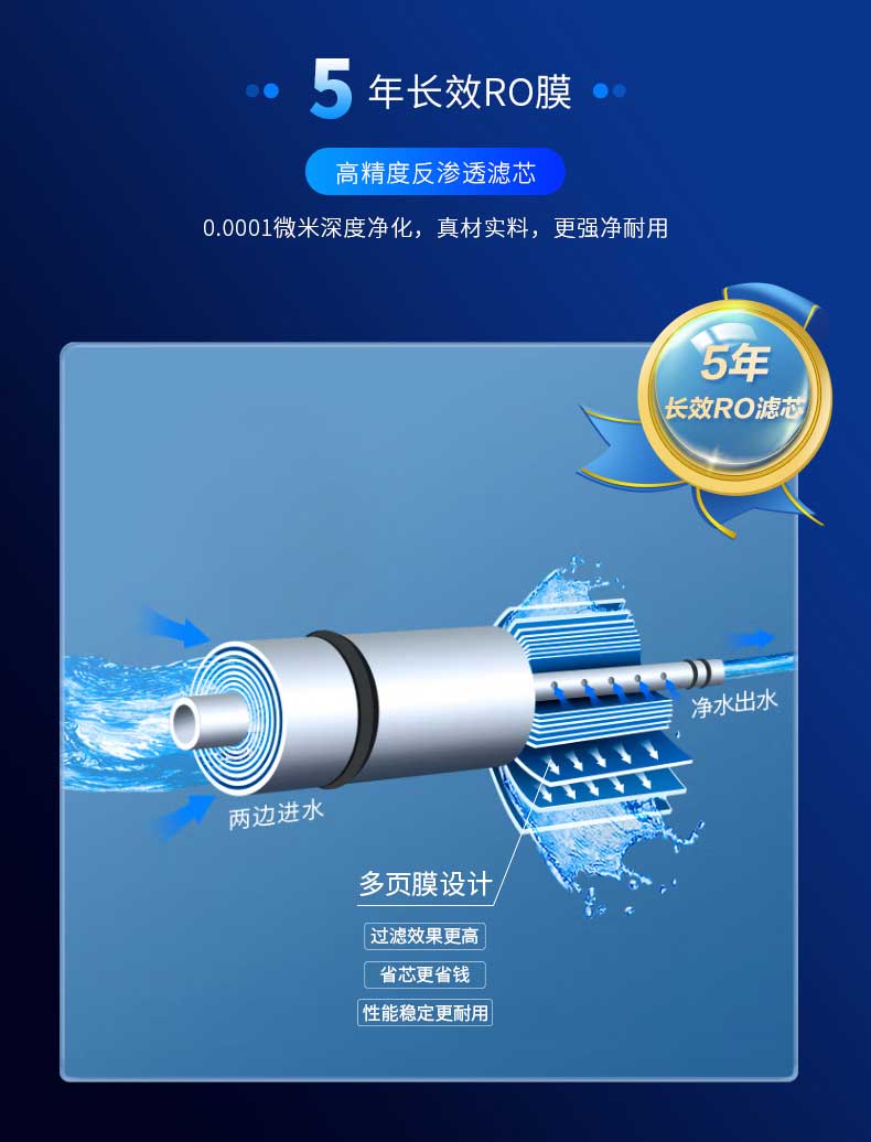 - 5年長(zhǎng)效RO膜,真材實(shí)料更強(qiáng)凈耐用