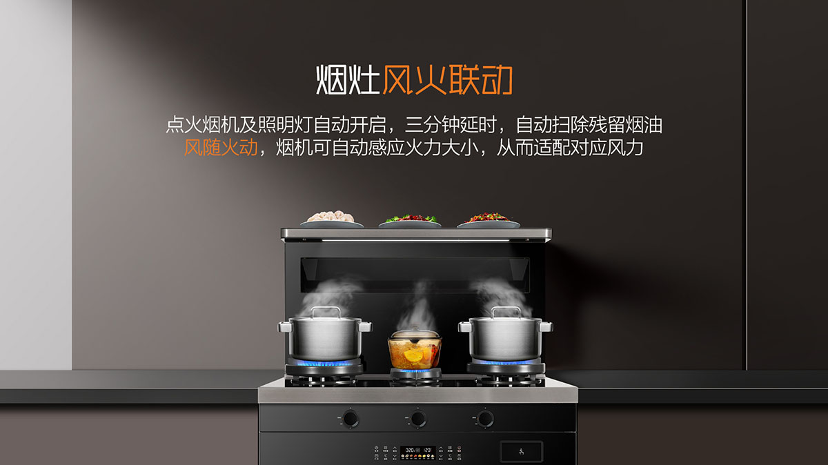 • 煙灶風火聯動,點火煙機自動開啟,風量隨火力大小自動調節