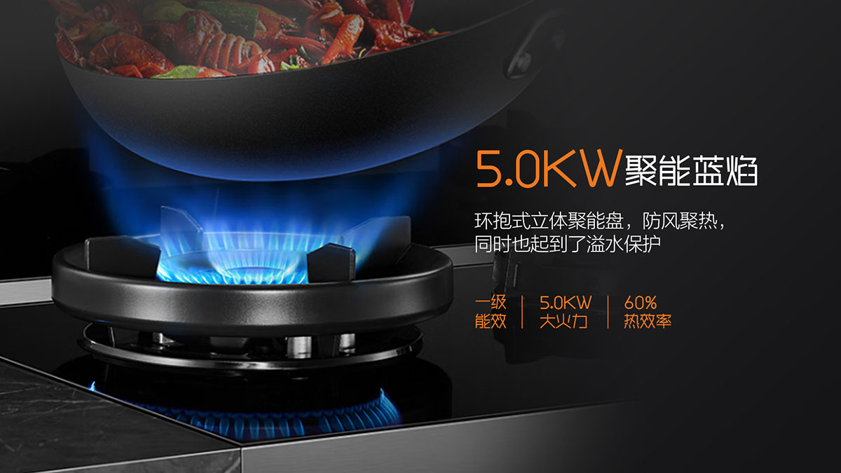 • 環抱式立體聚能環,防風聚熱,熱效率比普通聚能環提升15%