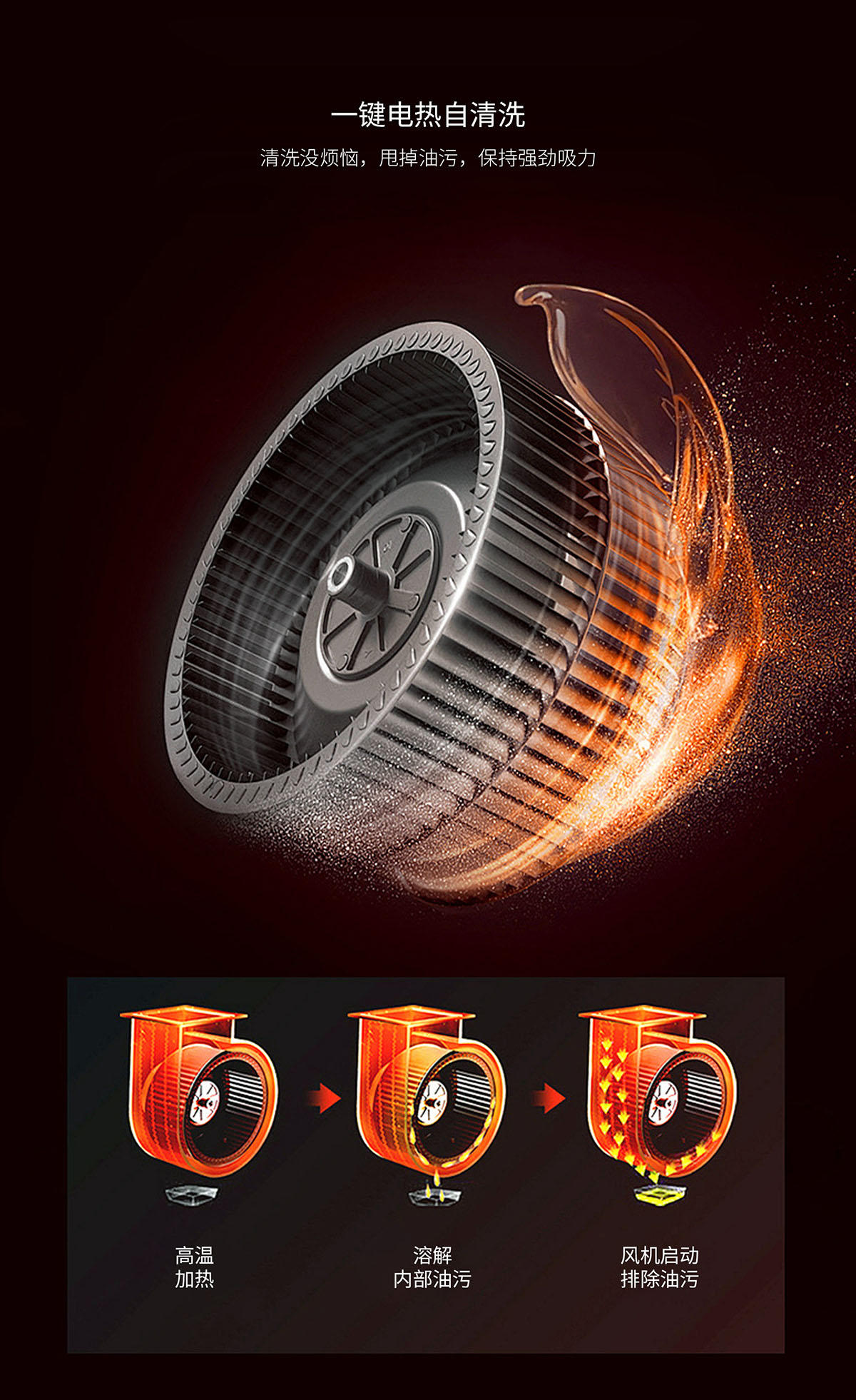 電熱自清洗,甩掉油污,保持強(qiáng)勁吸力