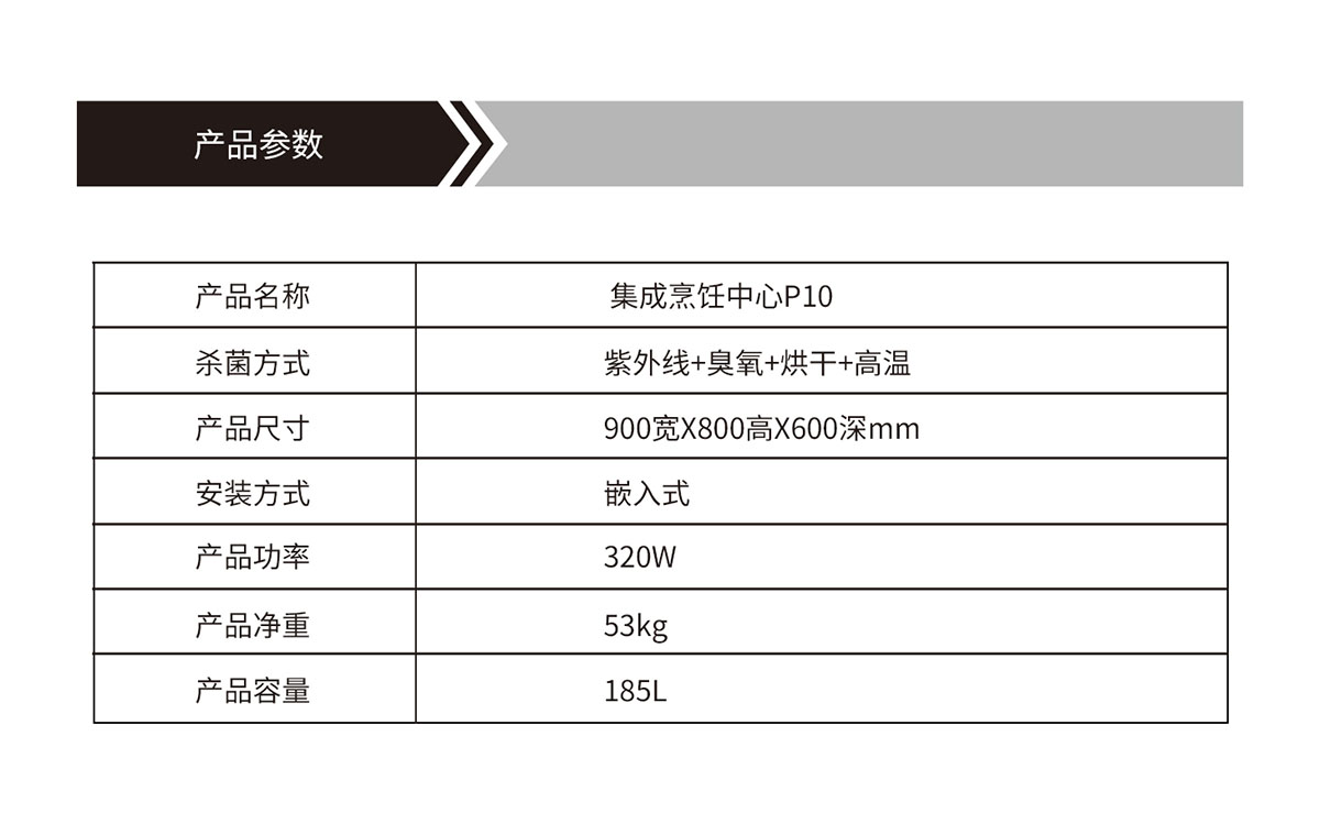 產(chǎn)品型號(hào):烹飪中心P10(大雙抽消灶款)產(chǎn)品名稱:集成烹飪中心(消+灶款)